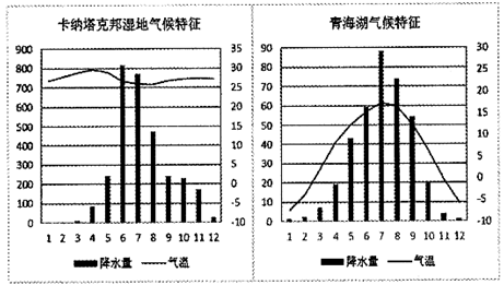 (1)由两地的降水柱状图可知,卡纳塔克邦湿地与青海湖都有降水补给;湿地与湖泊地势都较低,因而都有河流注入即地表径流补给和地下水补给。