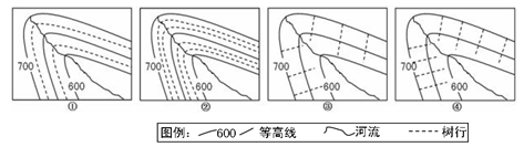 小题2:植树造林增加植被覆盖率是保持水土的最为有效的措施,对河流径流量的调节作用也很明显。下面四幅图(比例尺相同)中的植树造林方案,效果最明显的是: