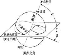 小题1:赤道平面与黄道平面形成黄赤交角,目前是23?26?.与回归线的度数是相同的。选择D项。
