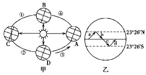 本题解析:读图可知:甲图中B点为3月21日,C点为6月22日,那么,从3月21日到6月22日前后,应位于①位置;从3月21日到6月22日前后,太阳直射点应从赤道向北回归线移动,在乙图上的a短;而此时期北极点上出现极昼现象;地球公转的速度变慢。故选B。