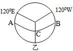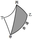 1、单选题 下图为经纬网的某部分,丙和乙在同一日界线上,阴影部分为黑夜,且此日出现极昼的最低纬线上的正午太阳高度为30°,读图回答下列各题。