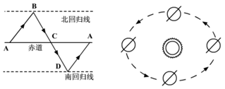 (1)将左图中的A、B、C、D标在右图适当位置上,并注出二分二至日。(8分)