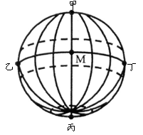 1.图中丙点的地方时为:2.如此时北京时间为10点,M点可能位于:3.当晨昏圈与经线圈重合时,可能出现的地理现象是: