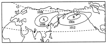 (2)因海陆热力性质差异,冬季陆地气温低,形成高压中心(2分)?副极地低气压带(2分)