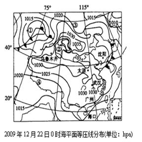 小题2:分析图中四座城市的气压分布状况可知,太原在高压区内天气晴朗,又是在晚上0时,气温较低,A正确;沈阳在冷锋后,受冷气团控制,属冷锋过境后的天气B错;海口附近陆上气压高与海上风从陆地吹向海洋,为偏北风,C错;武汉受高压控制,为晴朗天气,D错。