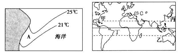 1.根据左图中等温线分布特点可知,该海区2.A洋流可能出现在右图中