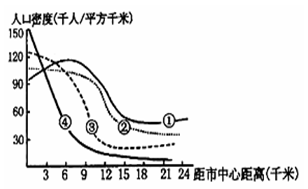 小题2:按中心区人口数量减少,郊区人口增多判断,城市发展的顺序为④③②①。所以本题选择B选项。
