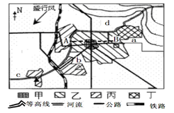 本题解析:小题1:由图中可知,甲在城市的中心位置,应为商业区;乙在城市边缘为住宅区,丙在郊外且是下风口,应为工业区,丁位于郊外、且靠近住宅区、上风口,可以考虑做文化区。