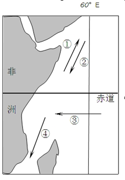 4、单选题 图中①~④箭头分别表示洋流的流向。读图回答题。