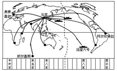 1、单选题 2011年11月3日~14日,神舟八号与天宫一号完成两次空间交会对接任务,于11月17日19时36分在内蒙古安全降落。图7为天宫一号和神舟八号交会对接任务测控网示意图。读图完成问题。