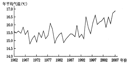 3、单选题 《安徽省应对气候变化方案》提出,安徽省应对气候变化面临巨大挑战,必须加快推进产业结构优化升级,转变经济发展方式。下图表示1962~2007 年安徽省年平均气温变化。完成1~2题。