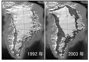 4、单选题 据新加坡《联合早报》网站10日报道,科学家指出,格陵兰岛和南极冰盖融化的速度正迅速加快,成为全球的海平面上升的主要原因,下图是格陵兰岛2002年与2010年冰架对比图,回答题
