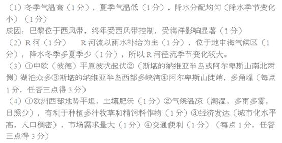 (1)与我国同纬度东部地区比较,巴黎的气候特征(冬、夏气温,降水季节分配)有什么不同特点,并简述其成因。(4分)