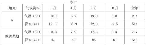 材料二?上图中N地与欧洲同纬度某地气候资料(表一)。