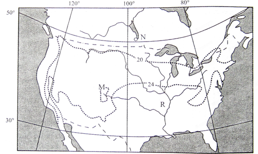 (1)20(2分)?M等值线为20℃~24℃等值线之间的闭合等温线(2分);M等值线内为河流源地,海拔高,气温低(2分)。