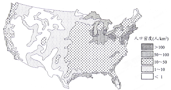 (4)从图中可以直接看出,美国人口分布不均,东北部、西部和南部沿海地区人口稠密,内陆人口稀少。结合地形分布可知,平原人口稠密,高原山地人口稀少。