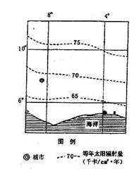 (1)描述图示区域年太阳辐射量的分布规律并分析原因。(10分)