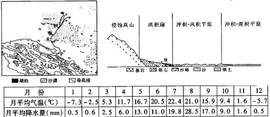 小题2:该地为温带大陆性气候,河流属于内流河,以高山冰雪融水和夏季降水补给为主,小题3:由于上游地区用水量大,导致河流尾闾地区水量减小,农业区萎缩;