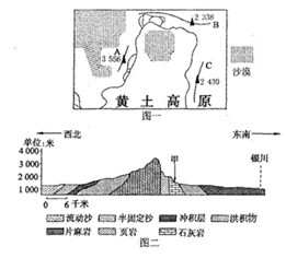 3、单选题 读我国某地区略图(图一)和某山地东、西坡地质剖面图(图二),该山地年降水量为200毫米,回答问题。