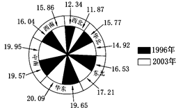 3、单选题 右图是1996年和2003年我国不同地区耕地数量占全国的比例(%)。读图回答题。