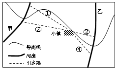 1.图中甲、乙两河的流量相当,向小镇引水线路最合理的是2.如果小镇通过上述线路引水,过度引用河水将导致