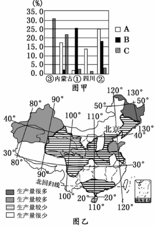 (1)写出A、B、C分别代表的能源矿产名称和图乙所表示的能源矿产的名称。