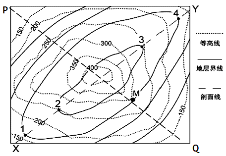 读图,向斜槽部延伸方向同一地层海拔高度范围相同,而褶曲方向,由中心向两翼的方向,由于地层弯曲变形,各地层的海拔高度往往有差异。从图中可以看到沿XY方向相同的地层线海拔高度相同,如1和2的海拔,或3和4的海拔范围相同。说明地层沿XY方向没有发生弯曲变形,地层呈水平状态。同一地层海拔高度相同,所以XY方向应该是槽部延伸方向。沿PQ方向同一地层海拔高度有差异,所以PQ沿线是褶曲方向,地层呈下凹状态,D对。