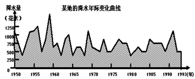 【小题1】从该地的降水年际变化曲线图可以看出,降水的年际变化很大,我国是没有温带海洋气候和地中海气候的,而且降水量大部分年份都在800毫米以下,不可能是热带季风气候,所以是温带季风气候,故选B.