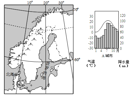 3、综合题 .图甲为欧洲部分区域示意图,图乙为图甲中A、B两城市的气温和降水量图。回答下列问题。(10分)