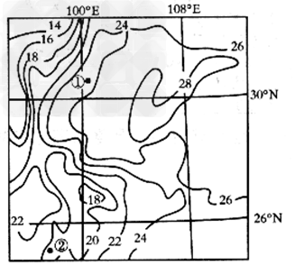 4、单选题 读我国某地区等温线(单位:℃)分布图,回答1—2题。