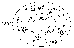 4、单选题 下图是以极点为中心的俯视图,箭头表示洋流分布位置及流向。读图,完成下列各题。