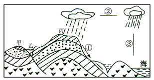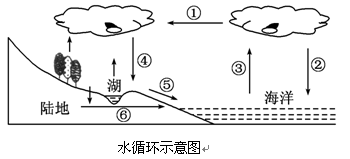 (2)从图中可知是海陆间水循环:从海洋蒸发③,箭头向上。水汽输送通过风从海洋上空到陆地上空②,在陆地上和海洋上降水,水从陆地在地表通过地表径流回到海洋①。