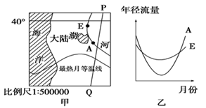 3、单选题 下面甲图中PQ为晨昏线的一部分,图示陆地地势较为平坦;乙图中的年径流量曲线是从甲图中A、E两处测得的。下列说法正确的是( )