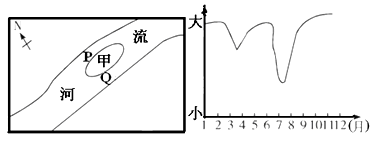 2、单选题 下面左图为我国某河流河道示意图,甲为一河心沙洲,右图为该沙洲一年内面积变化统计图。读图完成下列小题。