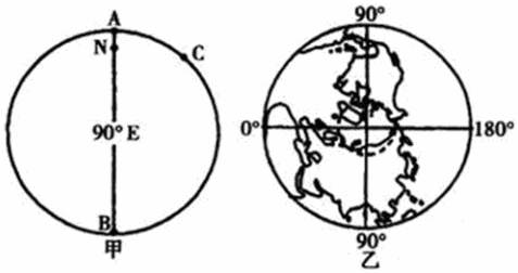 1、综合题 下图中甲图所示范围全部为昼半球,N点为北极点,B点为90°E经线与南极圈的交点,读图,完成下列各题。(10分)