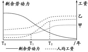 小题1:本题从图中可以看出T1到T2剩余劳动力大减,人均工资猛增,甲类企业在该区域维持最低经济效益所能支付的人均工资低于乙类企业(甲为劳动密集型产业,乙为技术密集型产业),这证明该地区在T1到T2阶段经历了产业结构调整升级;T2年后劳动密集型产业减少,技术密集型产业增多,不能说工业生产衰退。
