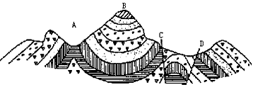 (1)在三大类岩石中,___________在该地区分布最广。图中A、B、C、D四处,属于背斜的是______。