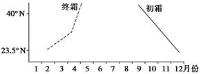 3、单选题 我国某中学地理研究性学习小组对霜冻现象进行探究性学习。下图是他们通过长期收听天气预报绘制的“我国东部地区的平均初霜、终霜日期曲线图”。回答题。