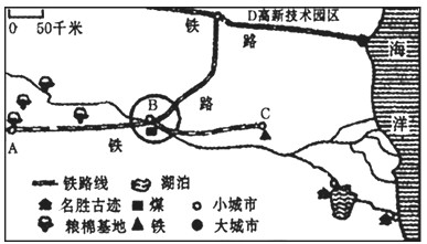 (2)B、C都是因矿产资源的开发而兴起的工业城市,从保护城市环境角度分析C城主导工业的区位选择。