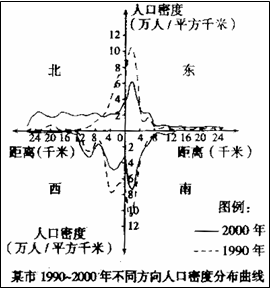 2、单选题 下图是“某市1990-2000年不同方向人口密度分布曲线”图,据图回答下列各题。