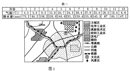 1、单选题 城市是人类活动对地理环境影响最深刻的地方,优越的地理环境更有利于城市的发展。读我国东部某城市多年平均气候资料(表一)和城市布局略图,完成问题。