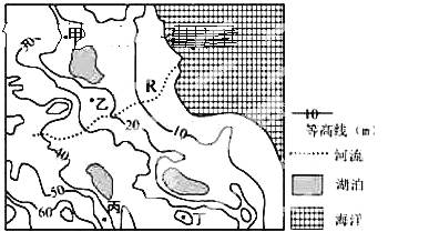 5、单选题 读世界局部地区等高线(单位:米)地形图(阴影甲、乙为湖泊),完成1~3题。