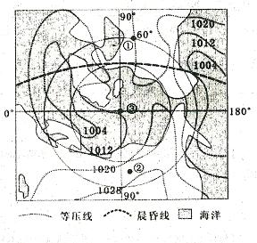 5、综合题 读某区域某时海平面等压线分布示意图,虚线为晨昏线,回答下列问题。