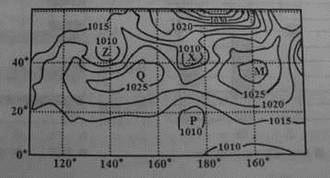 3、单选题 读世界某区域某月某时刻等压线分布图,回答下列各题。