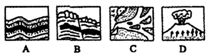 本题考查内外力作用与地表形态的变化。引起地表形态变化的作用,按其能量来源分为内力作用和外力作用。内力作用的能量主要来自地球内部的热能,表现为地壳运动、岩浆活动、变质作用等,它使地表形态变得高低起伏。外力作用的能量主要来自于地球外部的太阳能,以及重力能等,表现为风化、侵蚀、搬运、堆积、固积成岩。它将高山削平,把盆地填平,其结果往往使地表趋于平坦。图中A和B是由于地壳运动引起的岩石变形或错位,D是火山喷发。所以本题选择C选项。