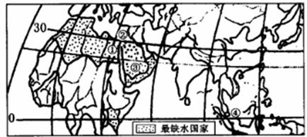 (1)世界上最缺水的国家中,绝大部分地区的气候特点是?,其原因主要是?。全世界有许多地区因水而引发冲突,其中最典型的是?地区。
