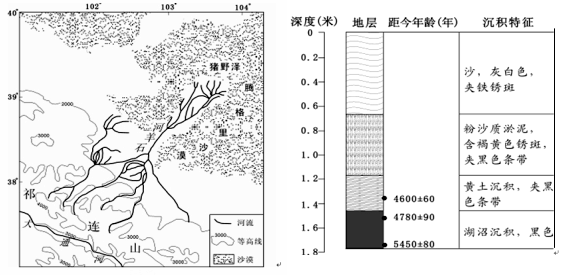 材料一:石羊河流域示意图(左图)材料二:石羊河流域某采样点垂直剖面图(右图)。