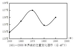 3、单选题 1951—2000年的近50年来,我国的干湿分界线存在明显的摆动。下图为该50年内干湿分界线位置变幅最大地区之一的变化图示。据此回答下列各题。