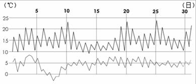 2、单选题  图表示某城市在2007年最热月及最冷月的逐日最高温及最低温的变化情况,读图完成以下各题。