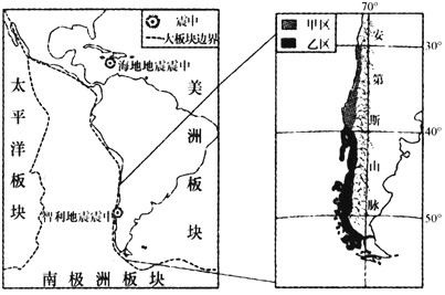 1、单选题  2010年1月,海地发生7.3级地震,几十万人遇难;同年2月,智利发生8、8级地震,数百人丧生。右图为两次大地震震中位置示意图。读图回答1~2题。